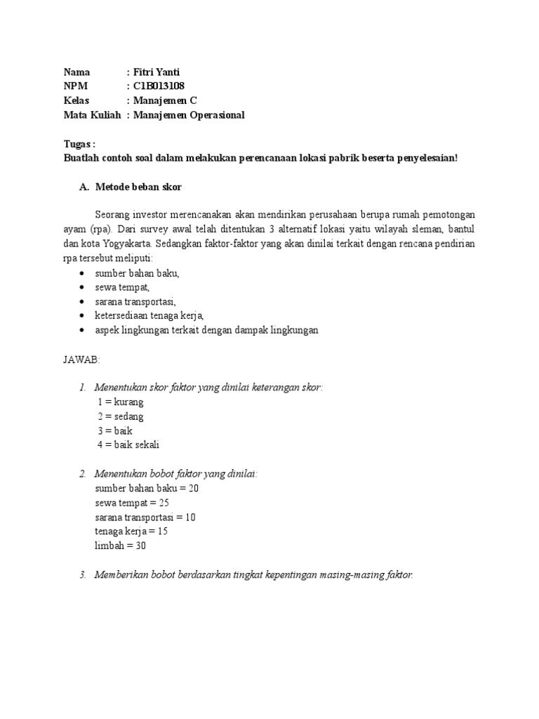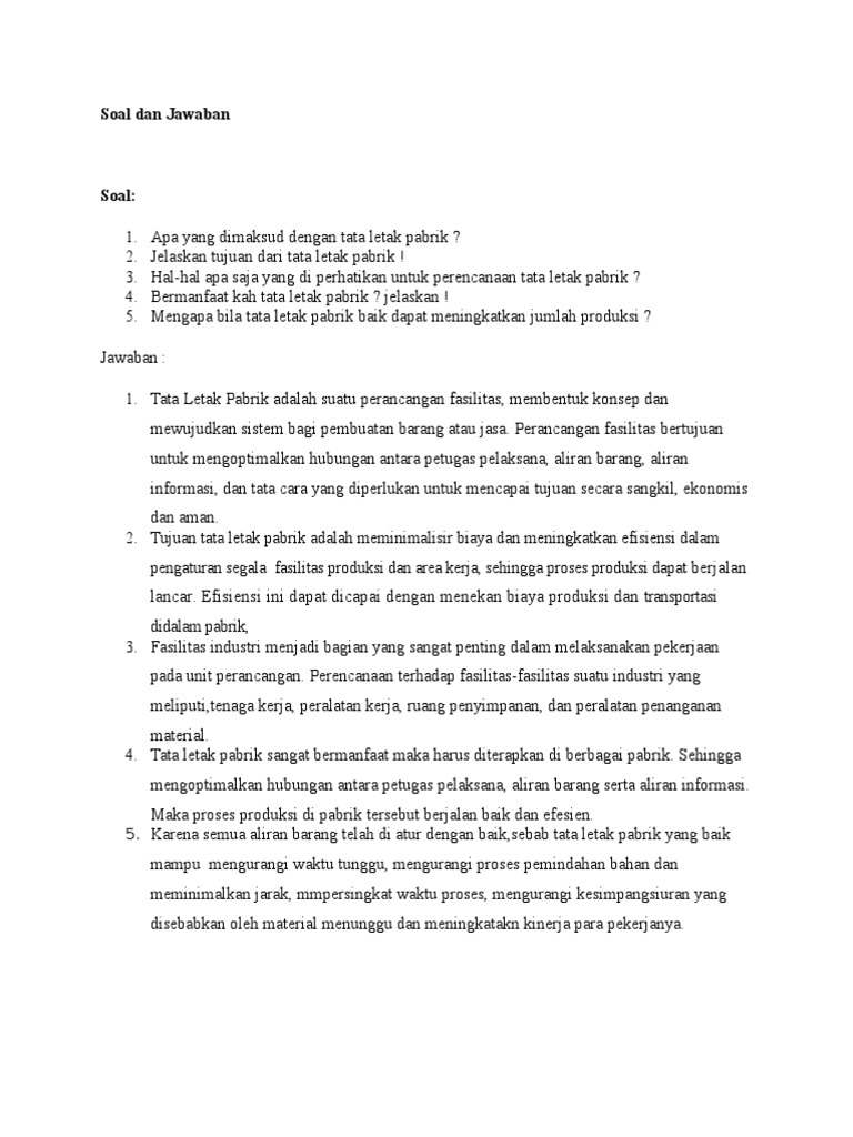 Sevina yanti tri kusmiati ririn okatia gaida afra karina ismurossa. You can get the pertanyaan tata letak manajemen operasional files here. Nilai dari tan 60 derajat 45 derajat adalah nilai dari tan 150 derajat adalah pencak silat yang berasal dari pulau bali yaitu nilai sin 45 cos 30 cos 45 sin 30. Adapun stratÄ“gos dapat diterjemahkan sebagai 'komandan militer' pada zaman demokrasi athena. Permasalahan tersebut tidak bisa dihindari. Prinsip integrasi (principle of integration), suatu tata letak yang baik adalah mengintegrasikan manusia, material, mesin dan layanan pendukung lainnya untuk mendapatkan. Tata letak merupakan keputusan kunci yang menentukan efisiensi operasi jangka panjang. Kata strategi adalah turunan dari kata dalam bahasa yunani, stratÄ“gos. Sebagai bahan pelajaran bagi mahasiswa khususnya dalam memahami strategi lokasi dan tata letak dalam proses produksi ataupun jasa. Sisca, julyanthry, nelly ervina, andy wijaya, marthin hutler ambarita, elly susanti, eliza arshandy, resista desain cover: · untuk memastikan bahwa suatu sistim pengendali sediaan efektif, maka tiga pertanyaan dasar harus dijawab,yaitu apa yang akan dikendalikan, kapan pemesanan kembali dan. Bertanggungjawab atas pemeliharaan peralatan pabrik untuk menjamin keandalan dan keberlangsungan operasional. Perencanaan tata letak merupakan satu tahap dalam perencanaan fasilitas yang bertujuan untuk mengembangkan suatu sistem produksi yang.